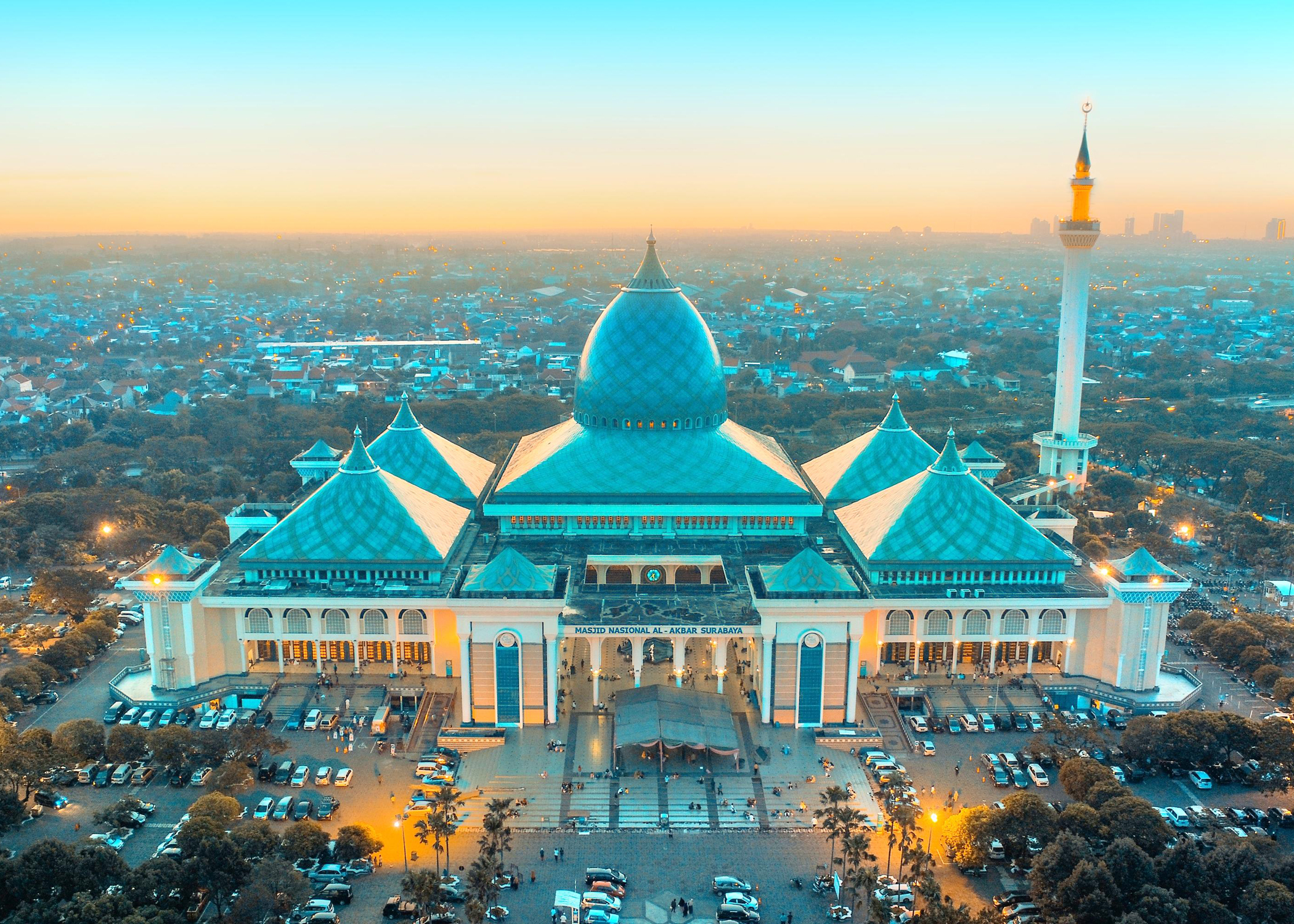 Al-Akbar National Mosque also known as Great Mosque of Surabaya, is a national mosque located in Surabaya, East Java. Its most distinctive feature is its large vertical dome, accompanied by four small blue domes. It also has a minaret with height of 99 meters, an ode to the 99 Names of Allah. The groundbreaking was initiated on August 4, 1995, after the idea by Soenarto Soemoprawiro, the Mayor of Surabaya at the time.