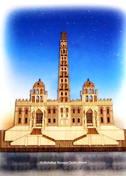 Al-Muhdar Mosque or Al-Mihdar Mosque is one of the historical mosques in the ancient city of Tarim, in the Yemeni province of Hadramaut. The building is characterized by Islamic geometric design. Its layout consists of an open courtyard surrounded by four corridors, the biggest of which contains the qiblah, which is adorned with three exquisite frescoes decorated with geometric, floral and scriptural motifs. In the center of the qibla corridor, there is the iconic minaret, which at about 50 metres high is the highest mudbrick structure on Earth.