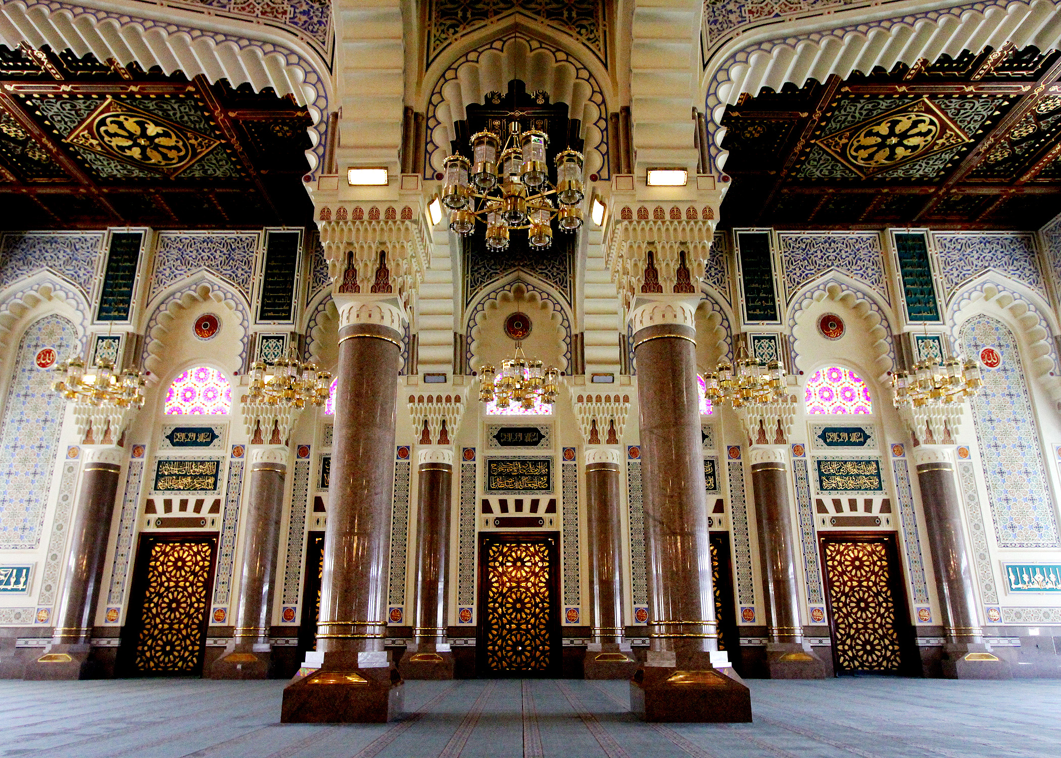 The layout is referred to as “Himyarite architecture”. The building has wooden roofs and seven ornate domes. Windows fitted with stained glass are locally referred to as qamariyah. While the plush carpeting contains intricate patterns, huge chandeliers have colorful and flower-like patterns. The three-storied building that includes the Quran College also contains libraries, and over two dozen classrooms, enough space to accommodate 600 students. The mosque has a modern central air conditioning and sound systems, as well as full security arrangements, including bomb-sniffing dogs. The building stays lit through the night.