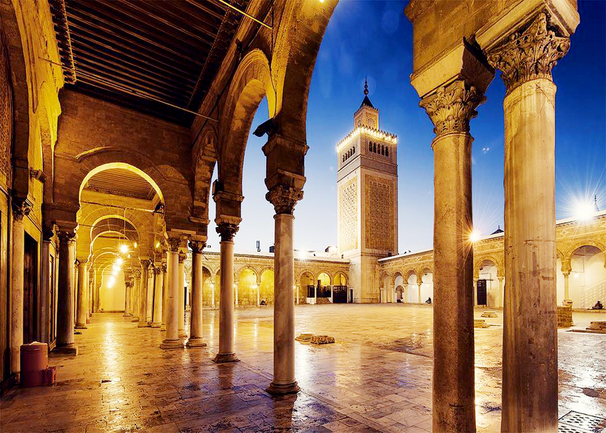 Al-Zaytuna Mosque, also known as Ez-Zitouna Mosque, and El-Zituna Mosque is a major mosque at the center of the Medina of Tunis in Tunis, Tunisia. It covers an area of 5,000 square metres with nine entrances. The mosque is known to host one of the first and greatest universities in the history of Islam. The courtyard is accessible via nine lateral doorways and forms a rectangle surrounded by galleries supported by columns made variously of marble, granite or porphyry and which were taken from ancient monuments. The exact date of building varies according to source. Ibn Khaldun and El-Bakri wrote that it was built in 731 C.E. by Ubayd Allah ibn al-Habhab. A second source states that the Umayyad Hisham ibn Abd al-Malik ordered the building; however, Ahmed In Abu Diyaf and Ibn Abi Dinar attributed the order to Hasan ibn al-Nu’man who led the conquest of Tunis and Carthage, and used it as a place of prayer.