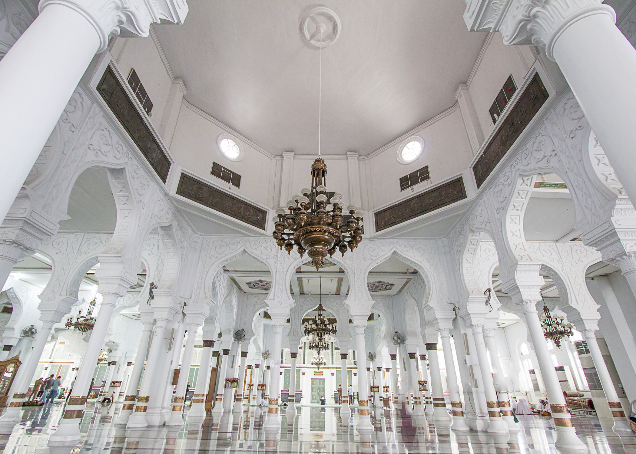 In 1879 the Dutch rebuilt the Mosque Baiturrahman as a gift to the Acehnese. Construction only began in 1879, when the first stone was laid was completed on 27 December 1881 during the reign of Muhammad Daud Syah, the last sultan of Aceh. The mosque was originally designed by the Dutch architect Gerrit Bruins. The design was subsequently adapted by L.P. Luijks, who also supervised the construction work. The interior area is of 1,500 square meter and has a capacity of 13,000 people. The interior is decorated with relieved wall and pillars, marble staircase and floor from China, stained-glass windows from Belgium, well-decorated wooden doors, and ornate bronze chandeliers. The building stones are from the Netherlands. Today the mosque has seven domes and eight minarets, and thirty-two pillars. The unique black domes are constructed from hard wood shingles combined as tiles.