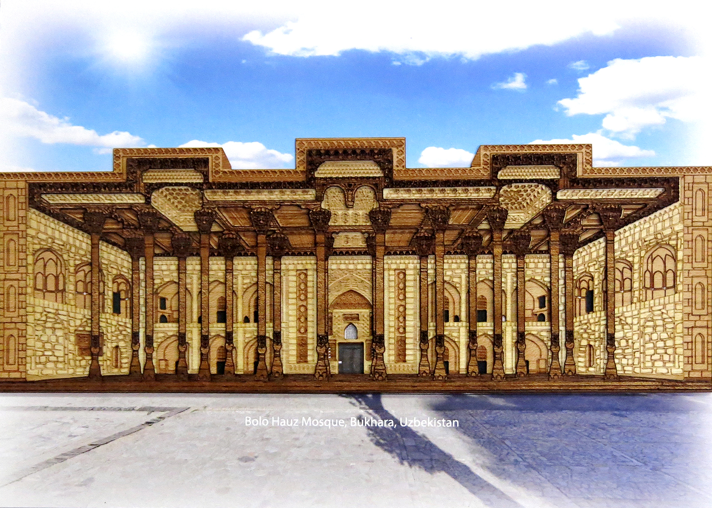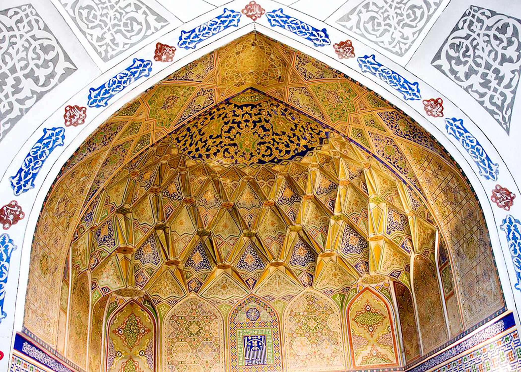 The prayer room during the winter time is a room with four columns and several entrances. The 12-meter-high iwan, comprising a 20-pillared hall measuring 42 by 10 meters, and bordered by bulged roofs sustained with twenty wood columns, serves as a summer prayer room attached to the three sides of the winter hall. The interior of the mosque is typical 18th-century Central Asian style.