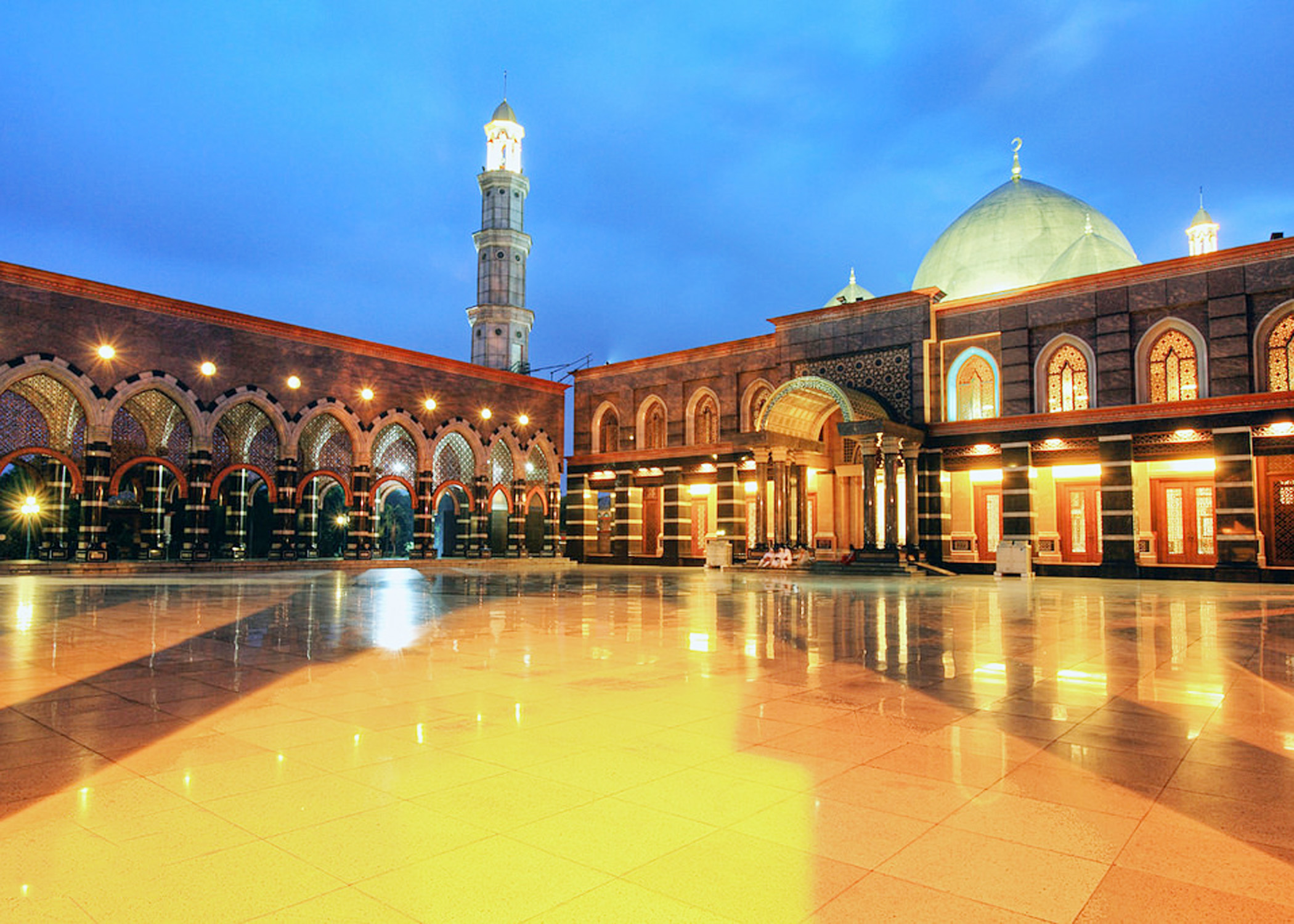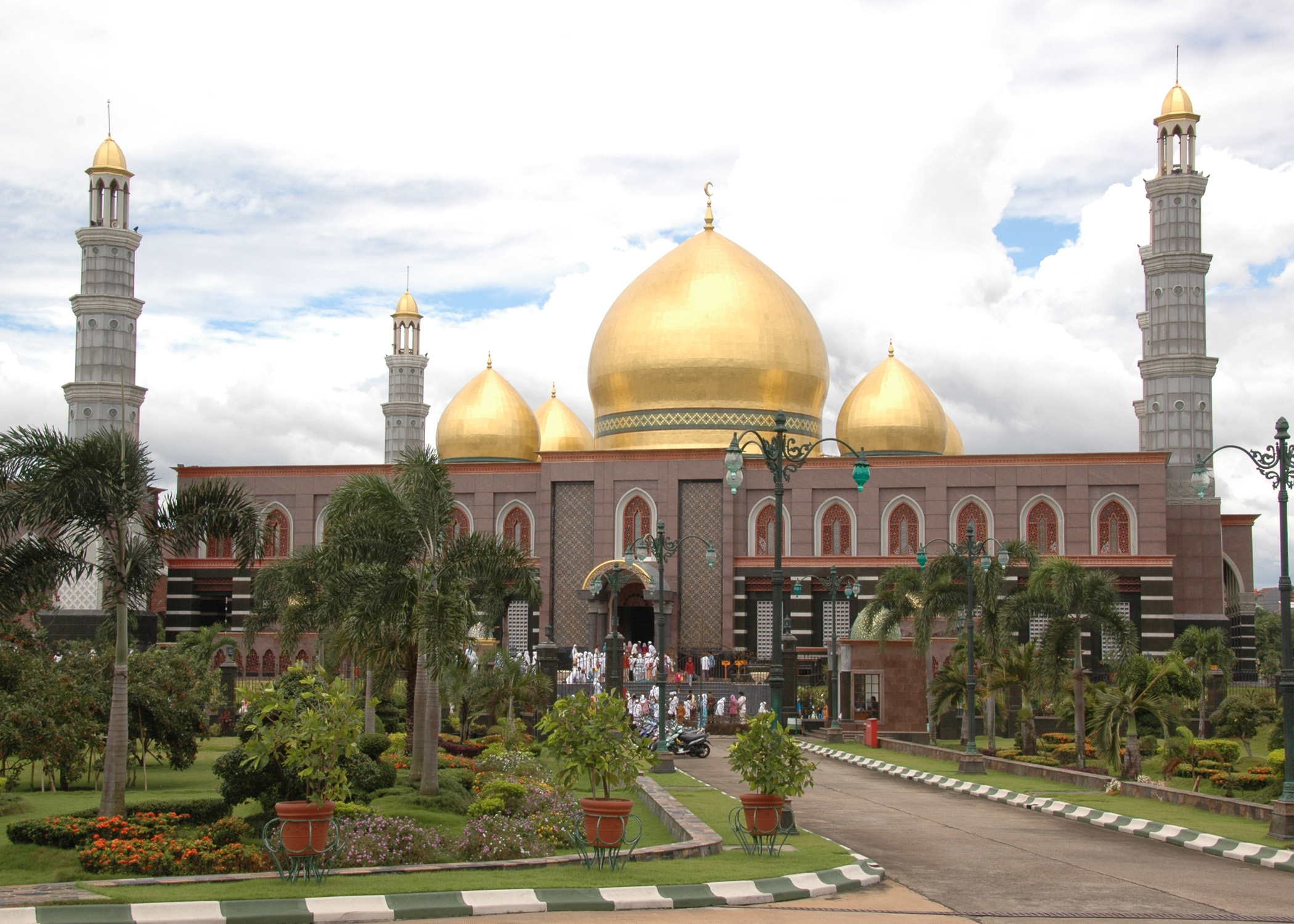 Dian Al-Mahri Mosque, also known as Golden Dome Mosque is built on the edge of Raya Street, Depok City in West Java, Indonesia. In addition to being a place of worship for everyday Muslims, this mosque complex is also a tourist area for family and attracts many people because of its domes made of gold. Because of the vastness of area and accessibility to the public, this place is often a holiday destination for family or a place to take a rest. The mosque was built by Hj. Dian Djuriah Maimun Al Rashid, a businesswoman from Banten, who has bought its land in 1996. The construction had begun in 2001 and finished around the end of 2006. The mosque was inaugurated to the public on December 31, 2006. With an area of 50 hectares, the building occupies an area of about 8000 square meters. The mosque itself can accommodate around 20,000 worshipers.