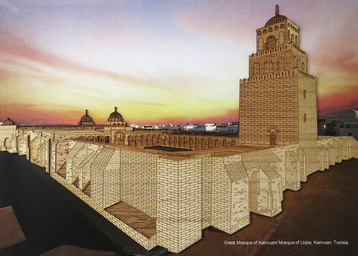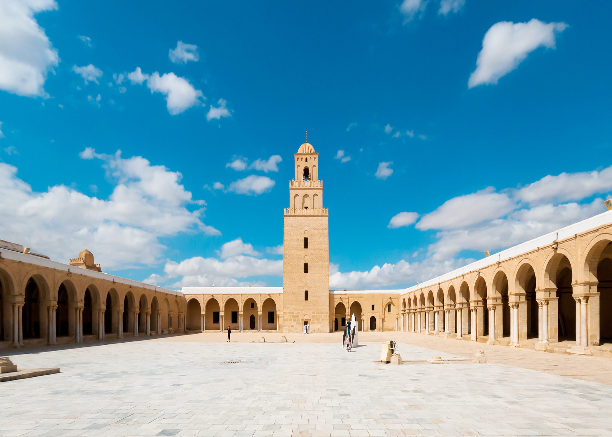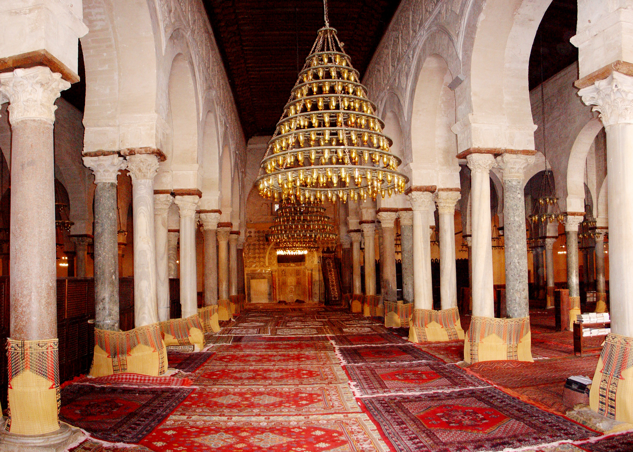 The Great Mosque of Kairouan is a mosque situated in the UNESCO World Heritage town of Kairouan, Tunisia and is one of the most impressive and largest Islamic monuments in North Africa. Established by the Arab general Uqba ibn Nafi in the year 670 CE at the founding of the city of Kairouan, the mosque occupies an area of over 9,000 square metres. Its perimeter, of about 405 metres, contains a hypostyle prayer hall, a marble-paved courtyard and a square minaret.