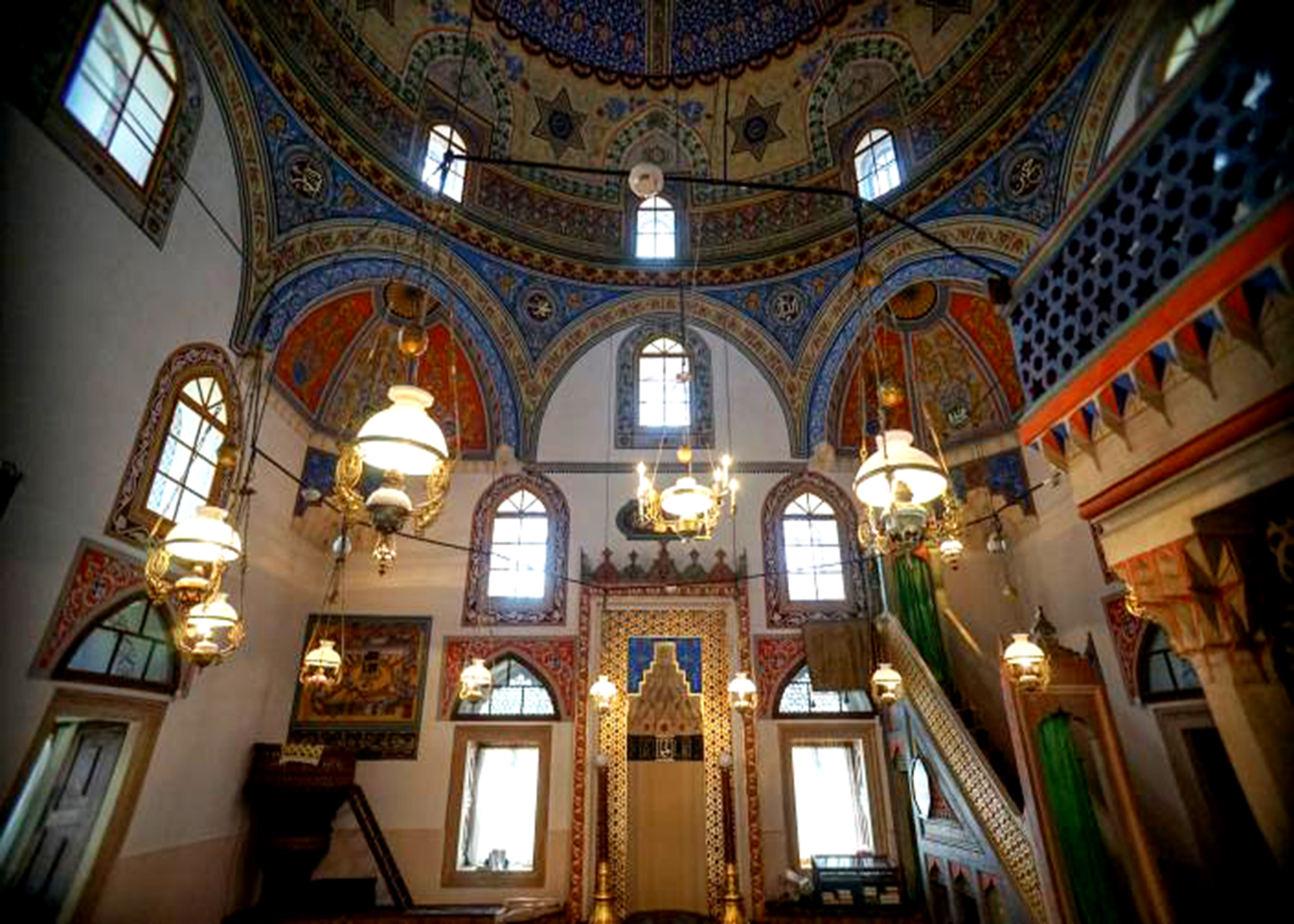 A minaret was added close to the southern side. After it being struck by lightning in 1911, it was rebuilt into a slimmer and higher one, which is now the highest minaret in the Balkans. The interior of the mosque and the porch are decorated with rich, in polychrome painted ornaments with floral motifs and quotations from Quran. Mihrab, mimber and mahvil abound in ornaments made in stalactites and in customary Turkish perforations.