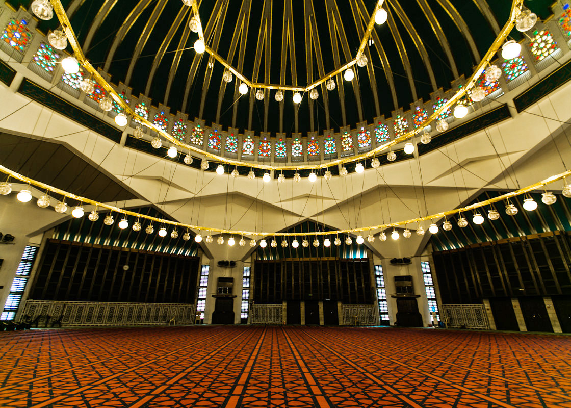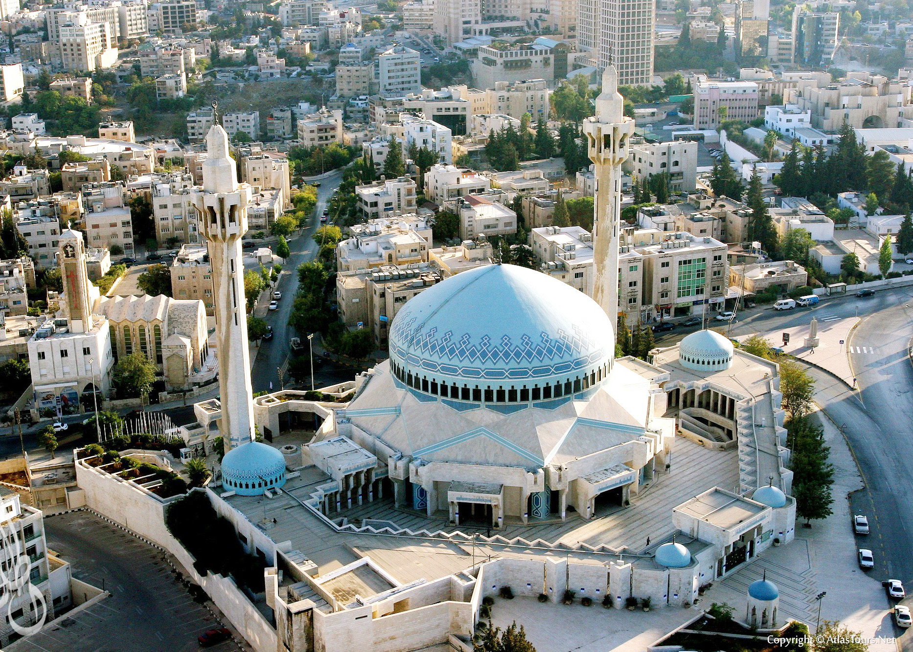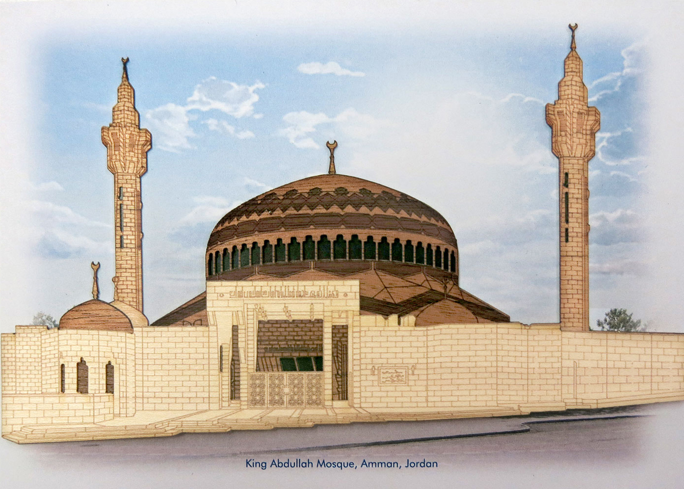 The King Abdullah I Mosque in Amman, Jordan was built between 1982 and 1989 and have an area of 18,000 square meter. It is capped by a magnificent blue mosaic dome beneath which 3,000 Muslims may offer prayer.