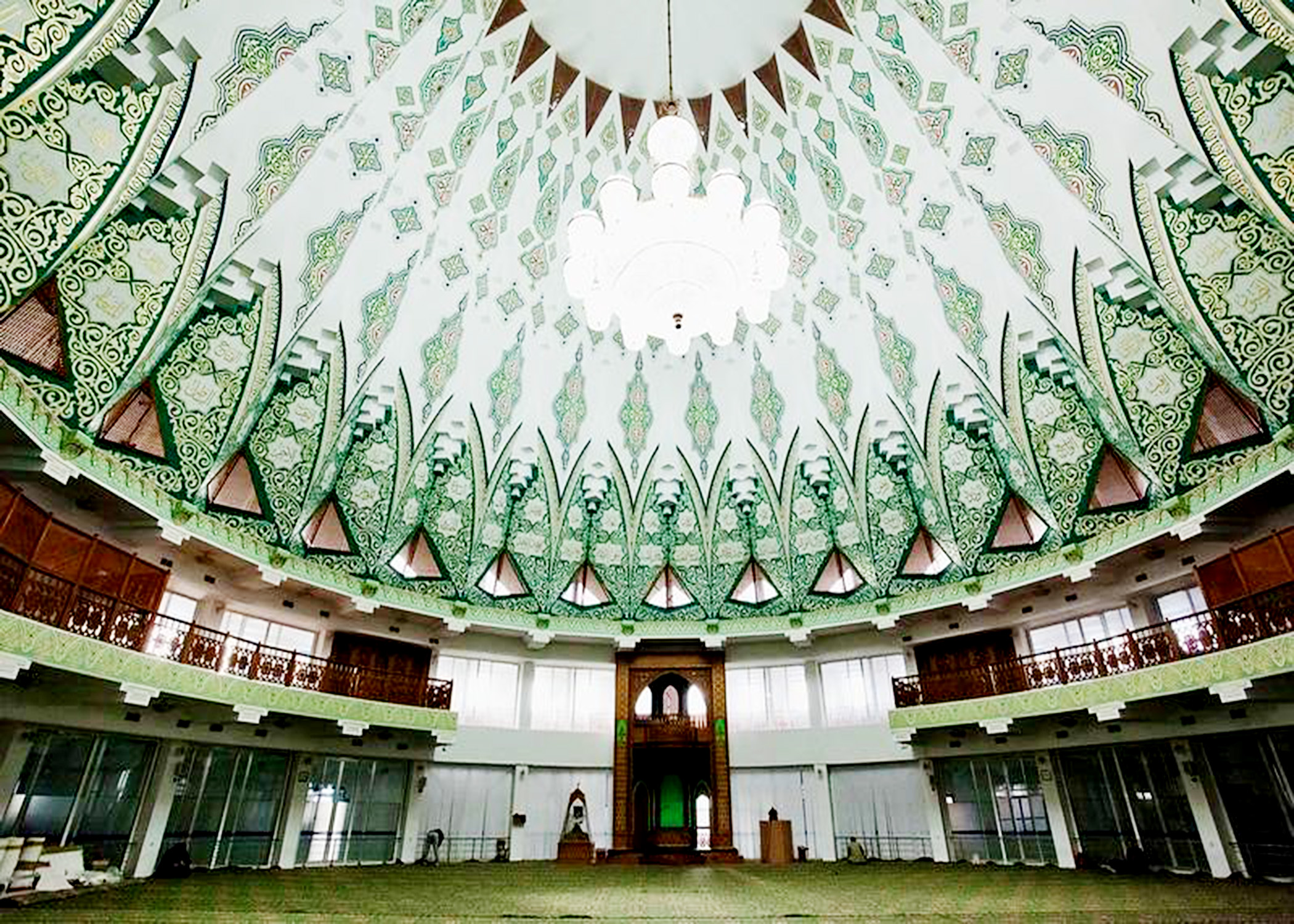 The men’s prayer room can accommodate up to 1200 people. The total area of the mosque is 7,240 square meters. The building has two floors. The base is composed of bricks, and the cupolas in metal. The ground floor of the mosque includes the teaching rooms of the madrassah, a prayer room for women with 300 seats, a wedding hall, a 300-seat canteen with auxiliary rooms, a room for ablutions and a wardrobe.