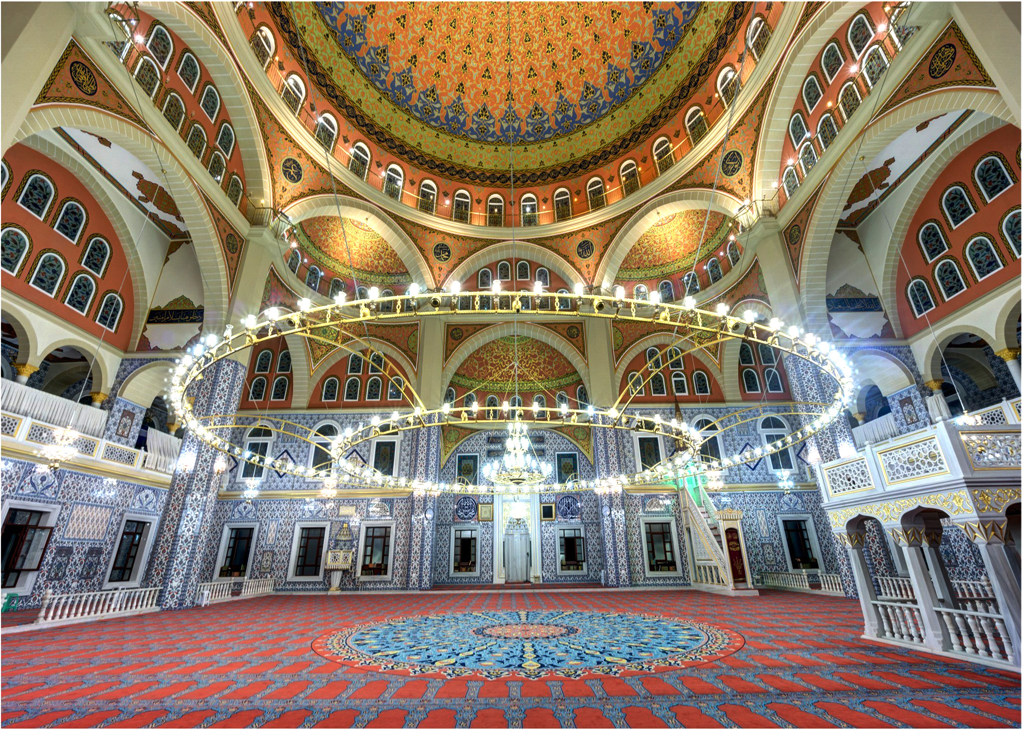 Inside the mosque are authentic Turkish ceramics on the walls and calligraphy on the ceiling. The dome is patterned with Turkish art and the custom-made carpet below is a reflection of it. There are 4 minarets that are 55 m high, which have stairs that go up to three platforms. There are 232 stained glass windows. Up to 6,000 people can be accommodated per service within the facilities of the central prayer hall for men and the prayer gallery for women. There are five wudhu facilities in one of the courtyards. On special occasions, the mosque is lit up in luminescent green and purple at night.