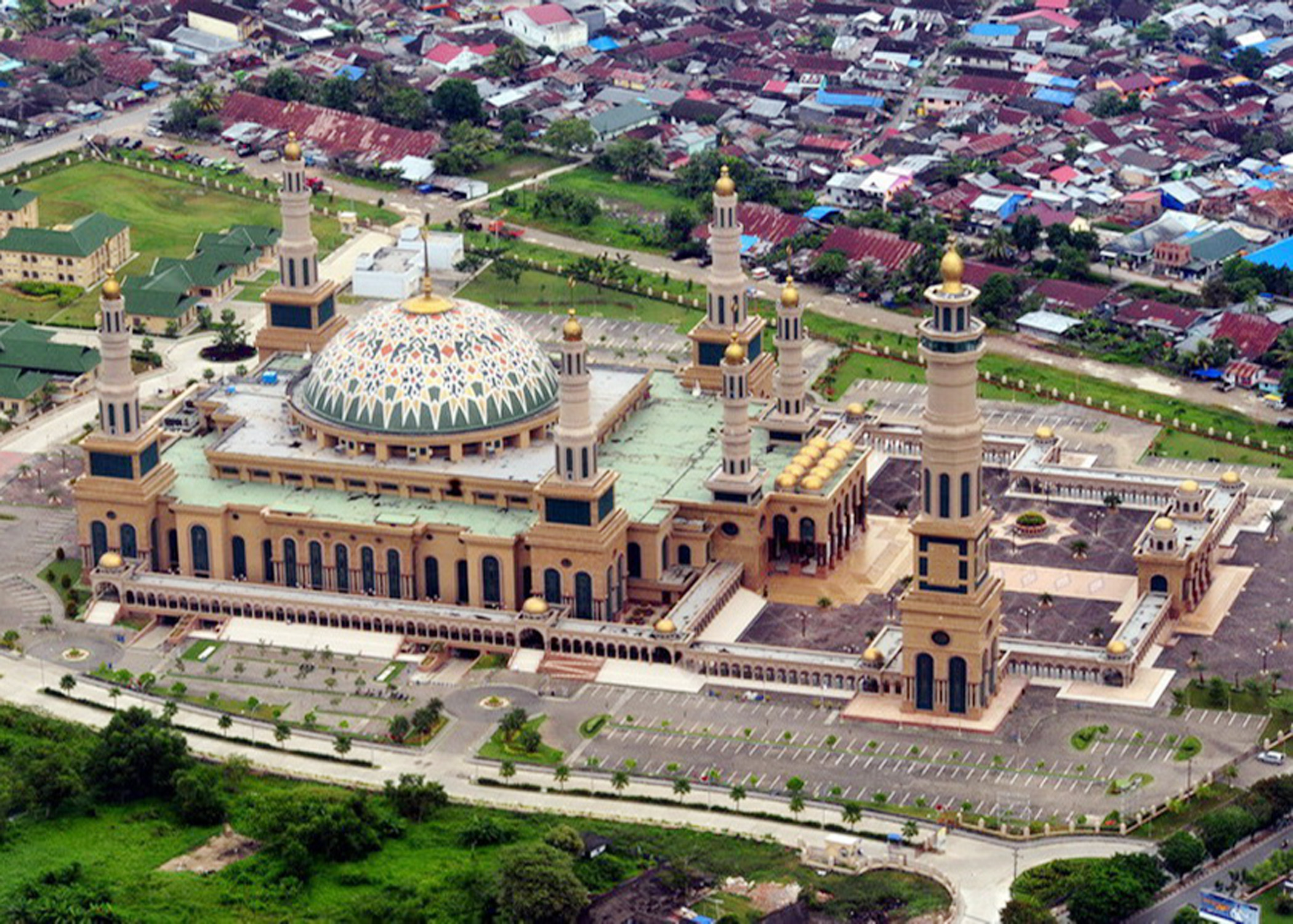 Samarinda Islamic Center Mosque, also known as Baitul Muttaqien Mosque, is a mosque located in the subdistrict of Teluk Lerong Ulu, Samarinda, East Kalimantan, Indonesia. It situates at the foreground of Mahakam River, and it has a huge dome. The mosque has a building area of 43,500 square meters, supporting building area of 7,115 square meters and the basement floor area of 10,235 square meters. The ground floor of the mosque has area of 10,270 square meters and the main floor has area of 8,185 square meters. The mezzanine floor area (balcony) is 5,290 square meters. The mosque has seven minarets, and the main tower reaches 99 meters, which is a reference to the Asmaul Husna, or the 99 names of Allah.
