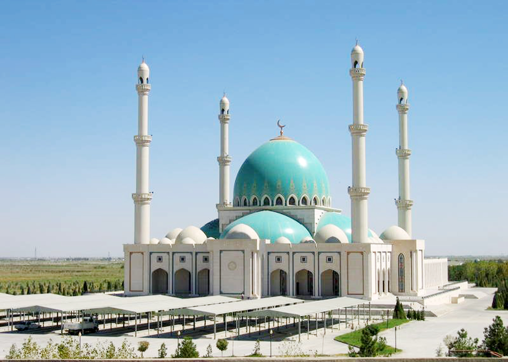 Small white domes adorn the perimeter of the complex’s ceiling as well as the mosque courtyard. A chandelier—having 260 lamps—hangs from the center of the mosque. The walls are embossed with motifs of traditional Turkmen carpets while the interior of all domes is decorated with pastel blue designs. The mosque is reported to have a capacity for 8,000 worshipers.