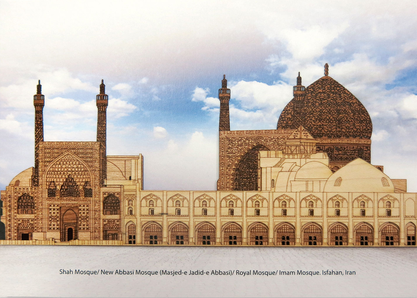 Another architect Badi al-zaman-i Tuni may have been involved in its early design. Standing in the public square, or Maidan, the entrance-iwan (gateway) to the mosque takes the form of a semicircle, resembling a recessed half-moon and measuring 27 meters in height, the arch framed by turquoise ornament and decorated with rich stalactite-like tilework called muqarnas, a distinct feature of Persian Islamic architecture. At the sides rise two minarets, 42 meters high, topped by beautifully carved, wooden balconies with muqarnas running down the sides. In the middle, in front of the entrance, stood a small pool and a resting place for the horses, and inside the worshipers found a large marble basin set on a pedestal, filled with fresh water or lemonade. This basin still stands as it has for four hundred years, but no longer serves the function of providing refreshments to the worshipers at the Friday prayers. The distinct feature of any mosque is the minaret, and the Masjed-e Shah has four.