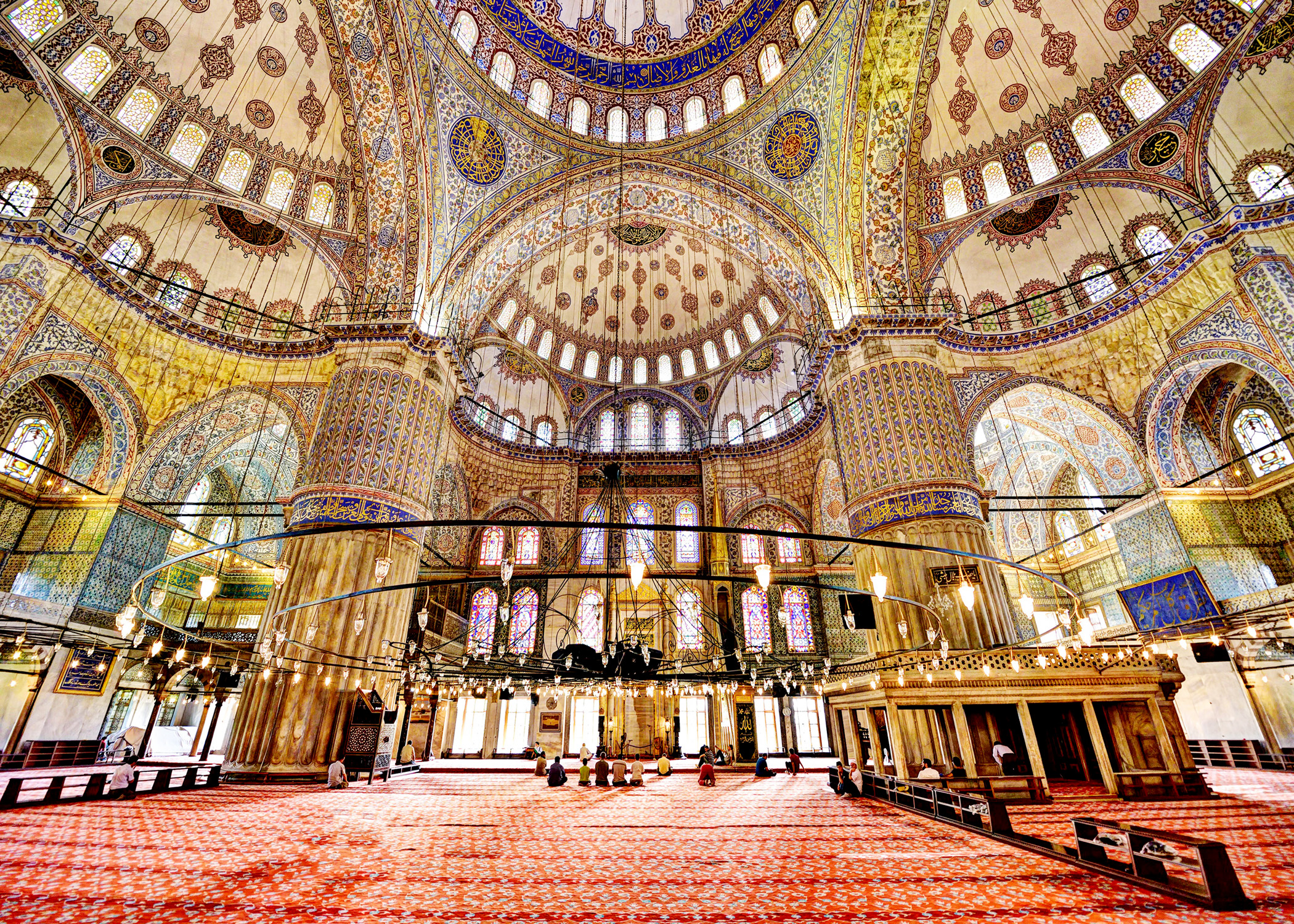 Hand-painted blue tiles adorn the mosque’s interior walls, and at night the mosque is bathed in blue as lights frame the mosque’s five main domes, six minarets and eight secondary domes. The Blue Mosque was included in the UNESCO World Heritage Site list in 1985 under the name of “Historic Areas of Istanbul”.