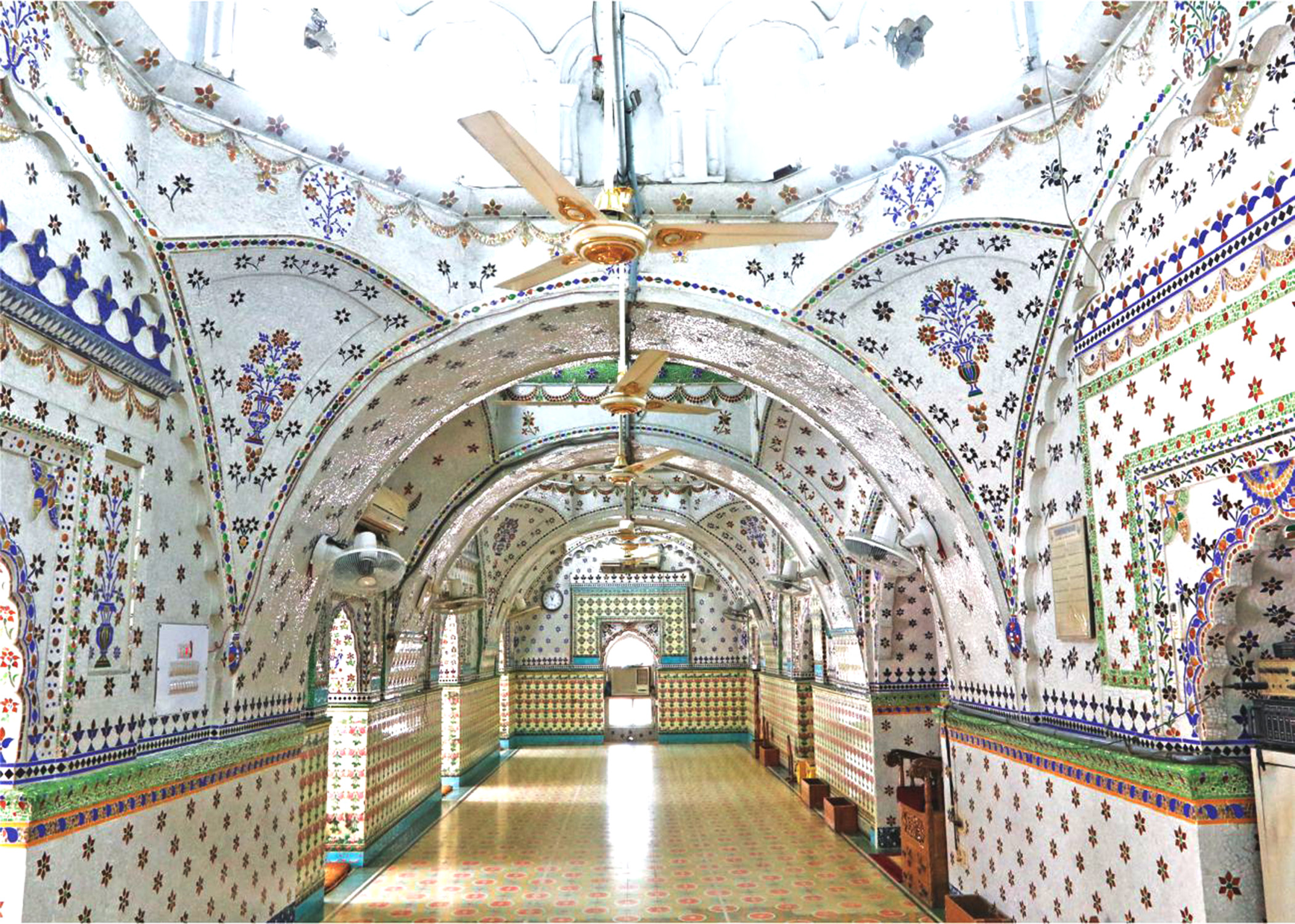 The Length of the mosque is 21.34 m & Width 7.98 m, it has 5 Domes & 4 Minarets. Chinitikri tile work assumes another texture by using assorted pieces of different designs of glazed tiles on the interior surfaces of the mosque.